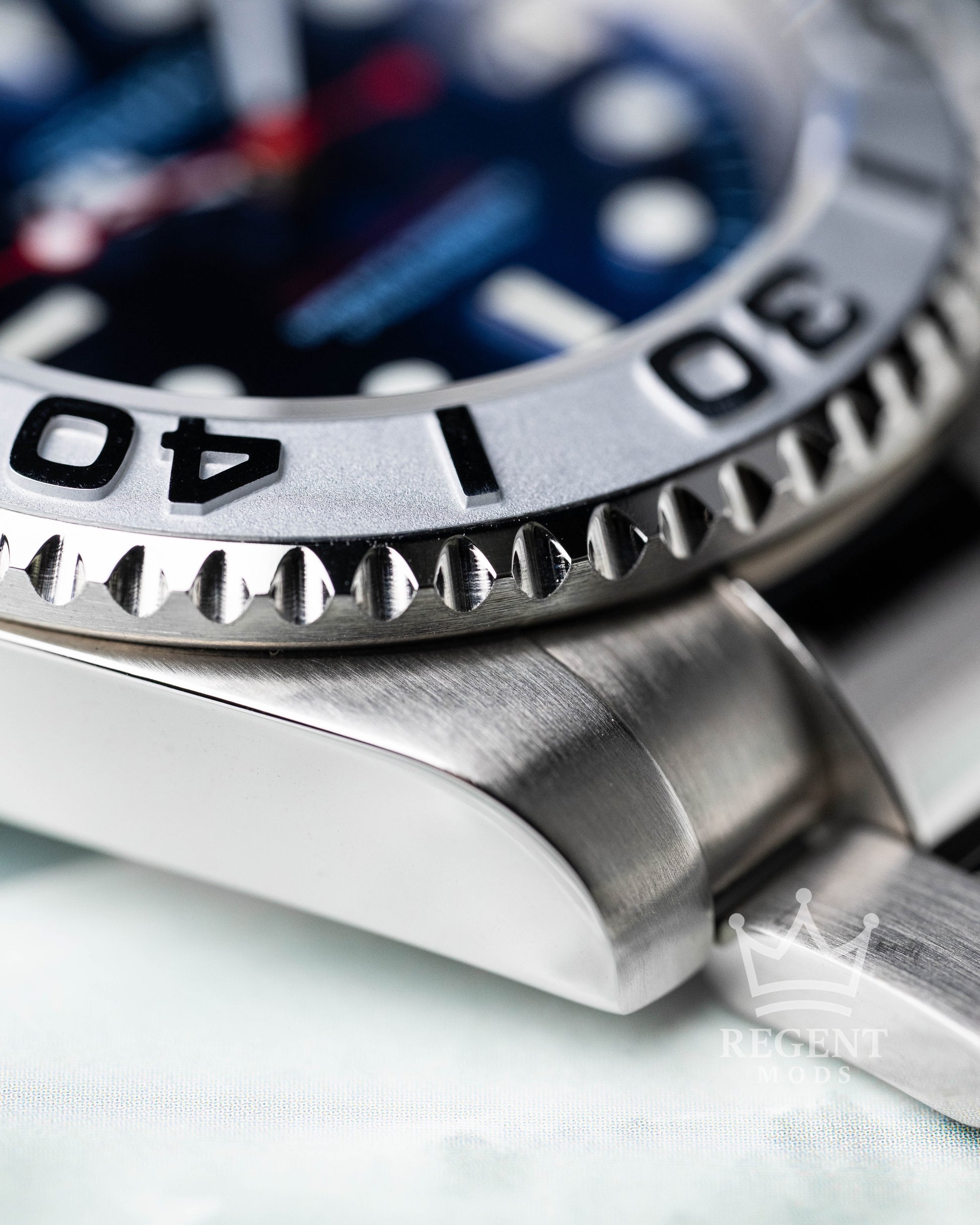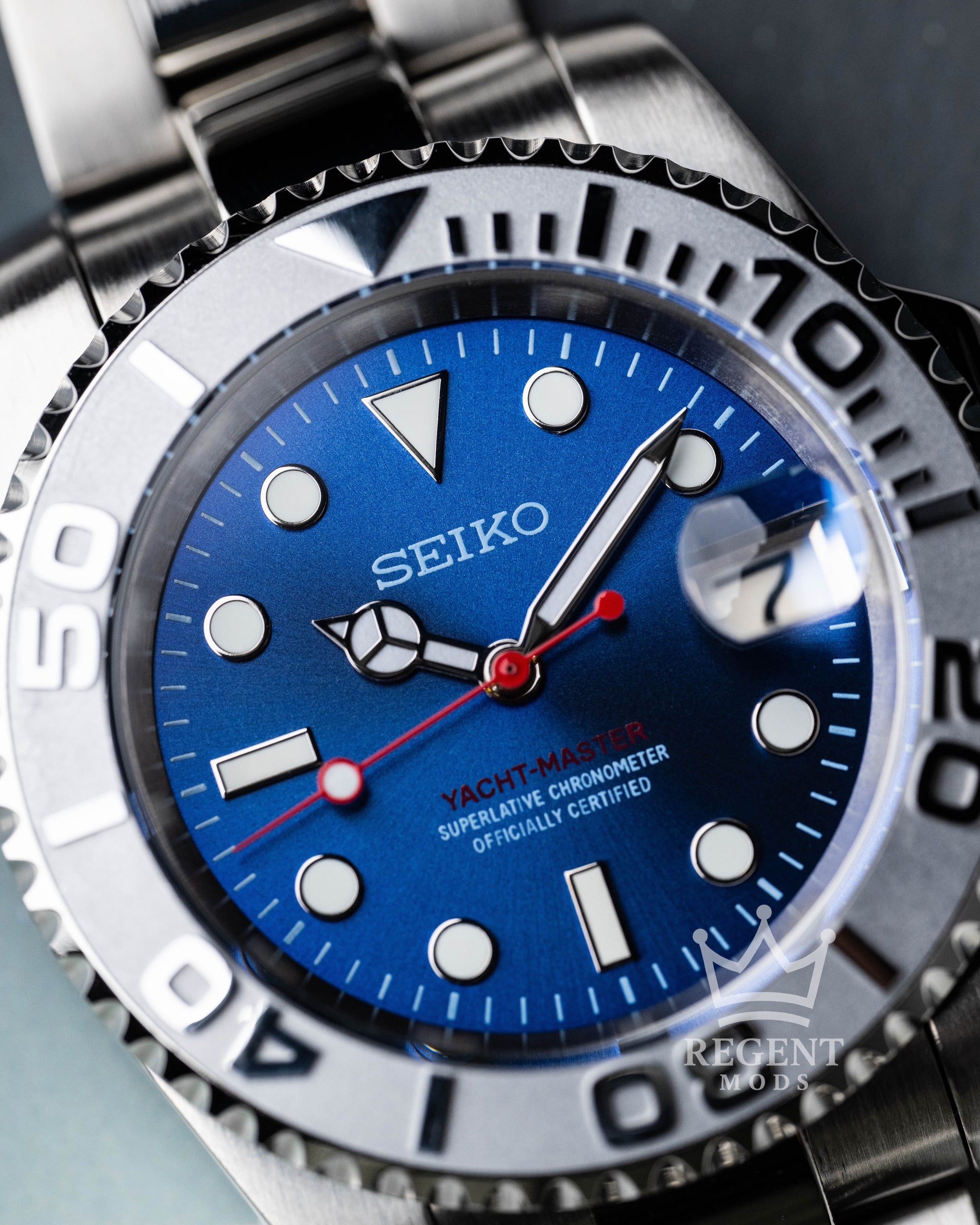 This Seiko Mod Yacht-Master homage takes a maritime classic and gives it a vibrant, modern twist. The electric sunburst blue dial commands attention, while the brushed silver bezel and bright red seconds hand add just the right punch of contrast.
