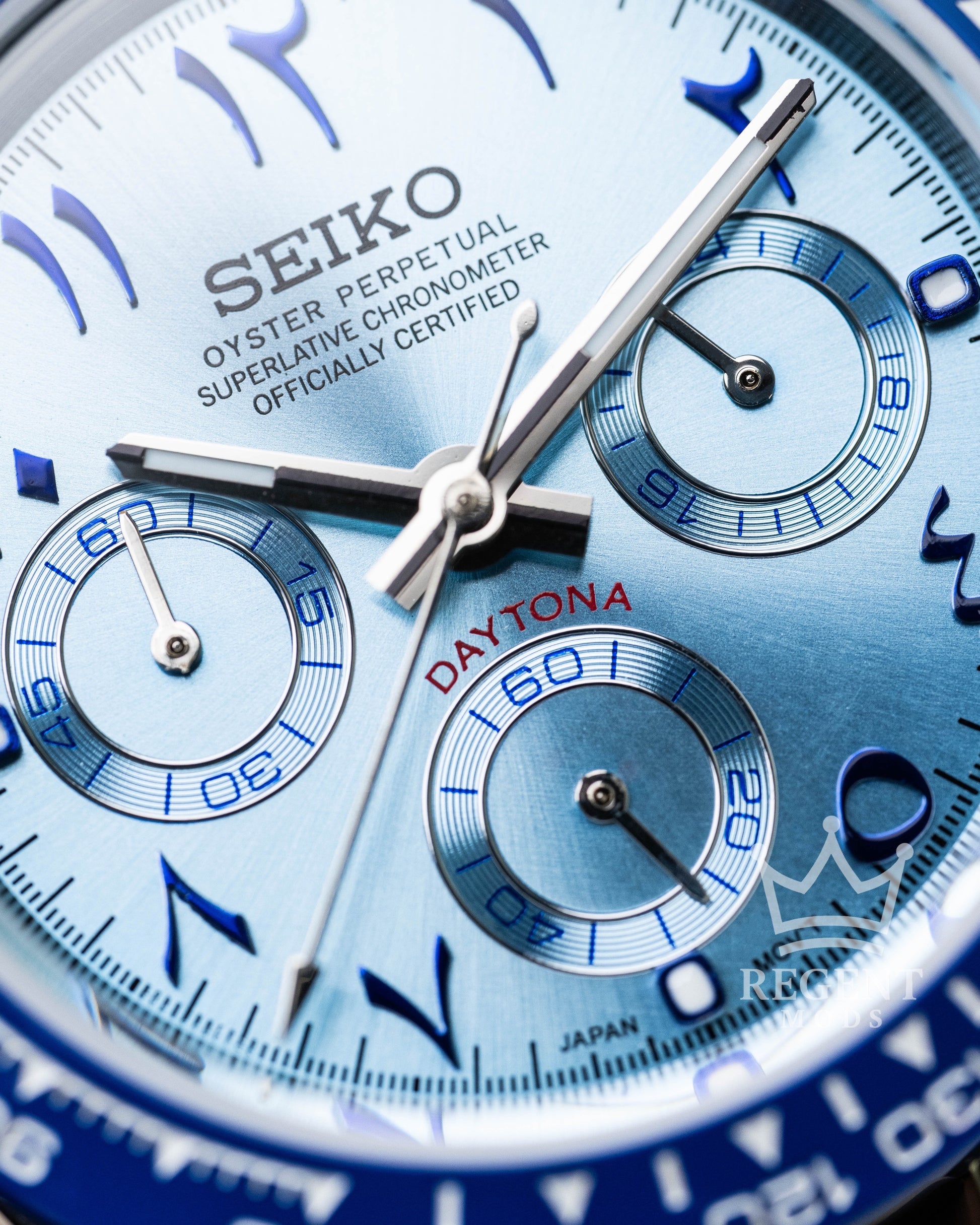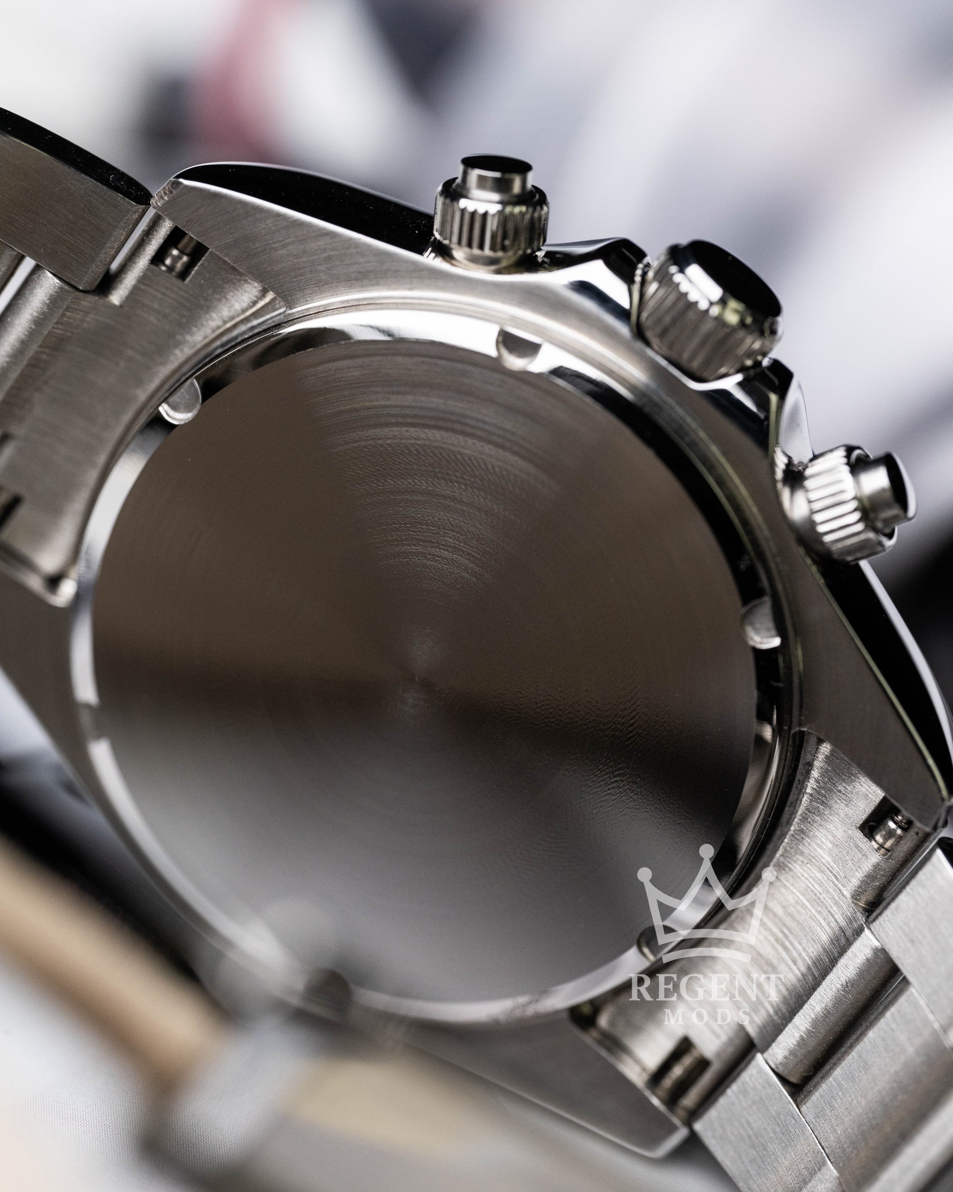 Powered by the trusted Seiko VK63 mecha-quartz movement, this Seiko mod delivers mechanical chronograph feel with quartz accuracy. Each detail—from the engraved tachymeter bezel to the perfectly aligned subdials—is crafted to echo the Daytona’s signature look while standing out as a bold statement of individuality.