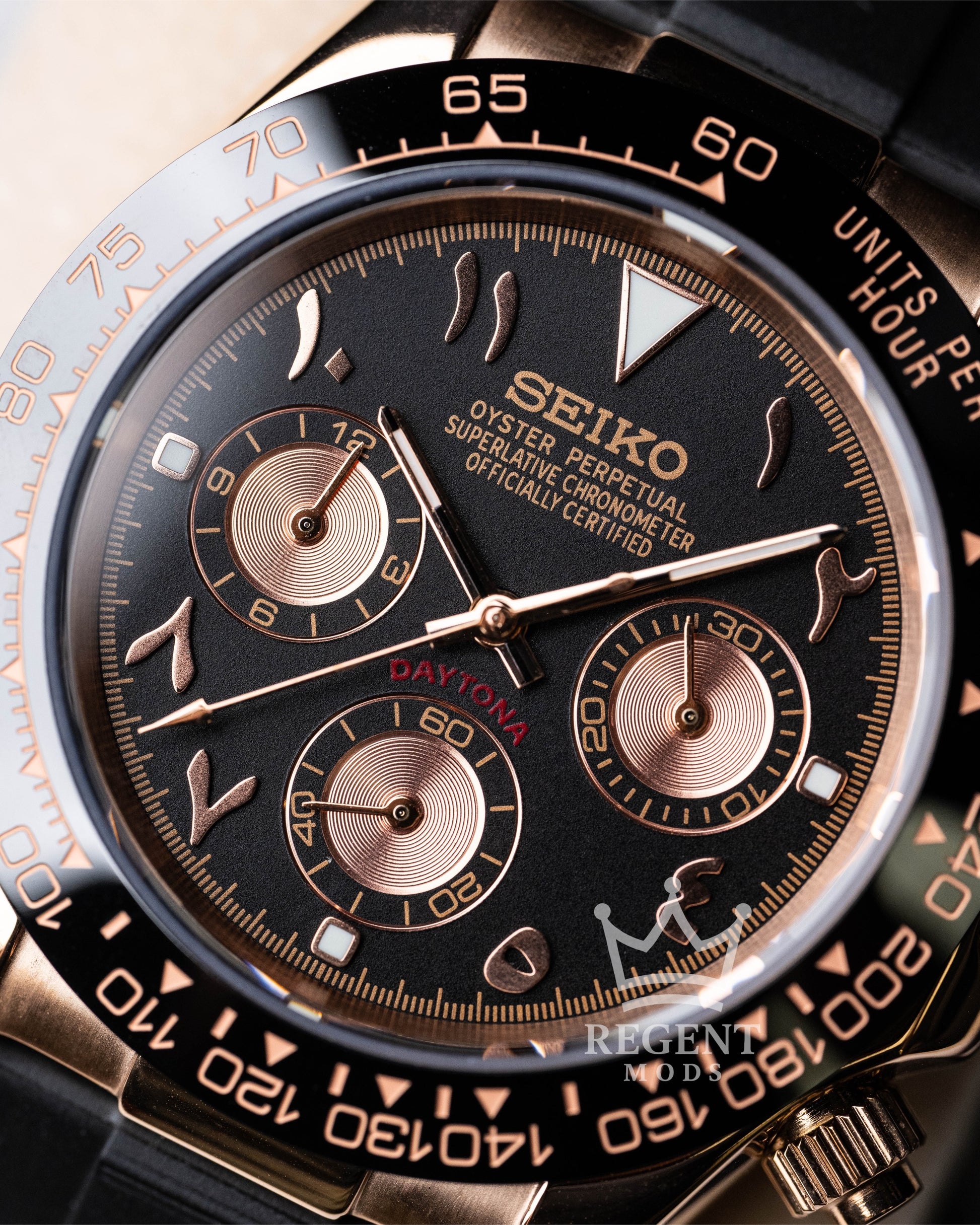 Powered by the trusted Seiko VK63 mecha-quartz movement, this Seiko mod delivers mechanical chronograph feel with quartz accuracy. Each detail—from the engraved tachymeter bezel to the perfectly aligned subdials—is crafted to echo the Daytona’s signature look while standing out as a bold statement of individuality.